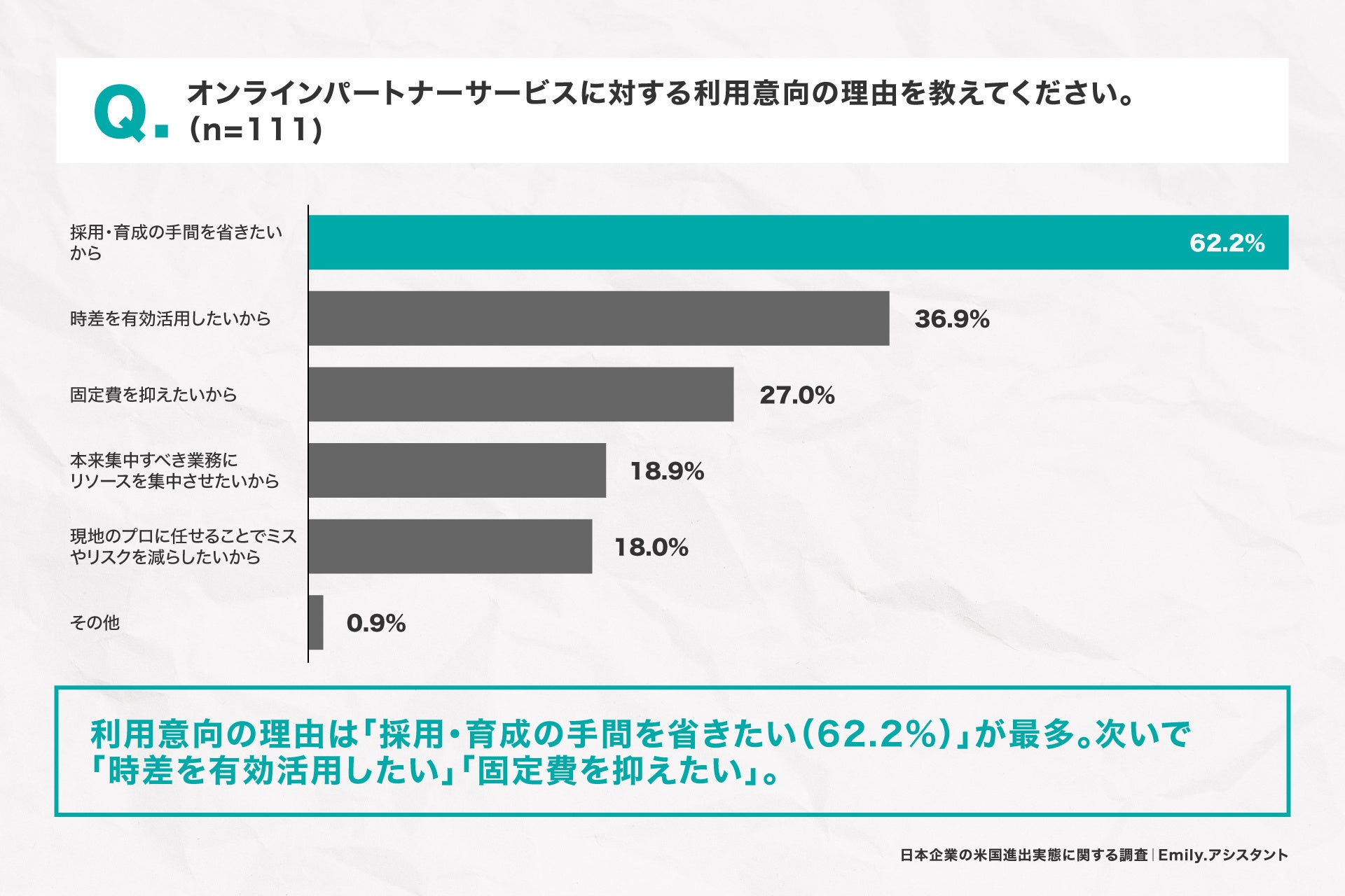 主な理由としては、「採用・育成の手間を省きたい」が62.2%で最も多く、次いで「時差を有効活用したい」(36.9%)、「固定費を抑えたい」(27.0%)が続きました。
