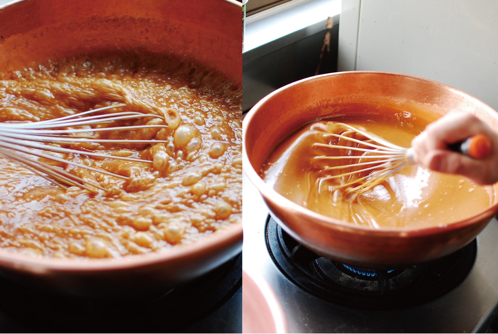お菓子のさかい自慢のブッセの生地に、ブッセ食感に合わせて通常より滑らかに仕上げたチョコレートクリームと、いわきチョコレートにて銅鍋で少量ずつじっくり炊き上げたキャラメルを、1枚1枚手作業で丁寧に絞ります。隠し味に、お菓子のさかいの「カリントまんじゅう」で使用している「焦がし黒蜜」を入れ甘みにコクを足すことで、チョコレート、キャラメルの甘さが引き締まり、バランスの良い味わいとなりました。また、ブッセ生地上部に振りかける粉糖に天然岩塩も使用し、めひかり塩チョコの塩味をほのかに再現。冷やして食べるとチョコレートのパリッとした食感と、キャラメルの濃厚な甘みがより引き立ちます。