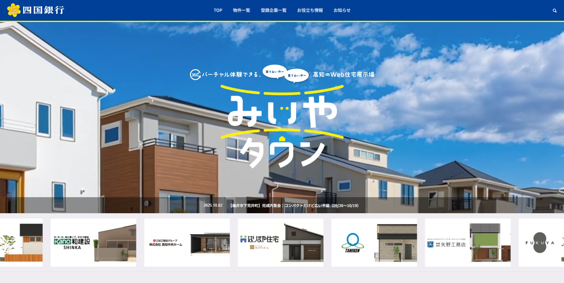 『四国銀⾏ みいやタウン』は、四国銀⾏・福井コンピュータスマート・電通コンサルティングが協業して、住宅検討者と住宅事業者との出会いの場を提供することで、地域の住宅流通活性化および地域経済の底上げを図るものです。