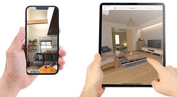 3Dモデルハウスの細かいディテールまで再現された写真のようにリアルな360度パノラマパースが閲覧できます。タブレットやスマートフォンでのタッチ操作や端末をかざしながら⾒渡して具体的な空間イメージを把握できます。