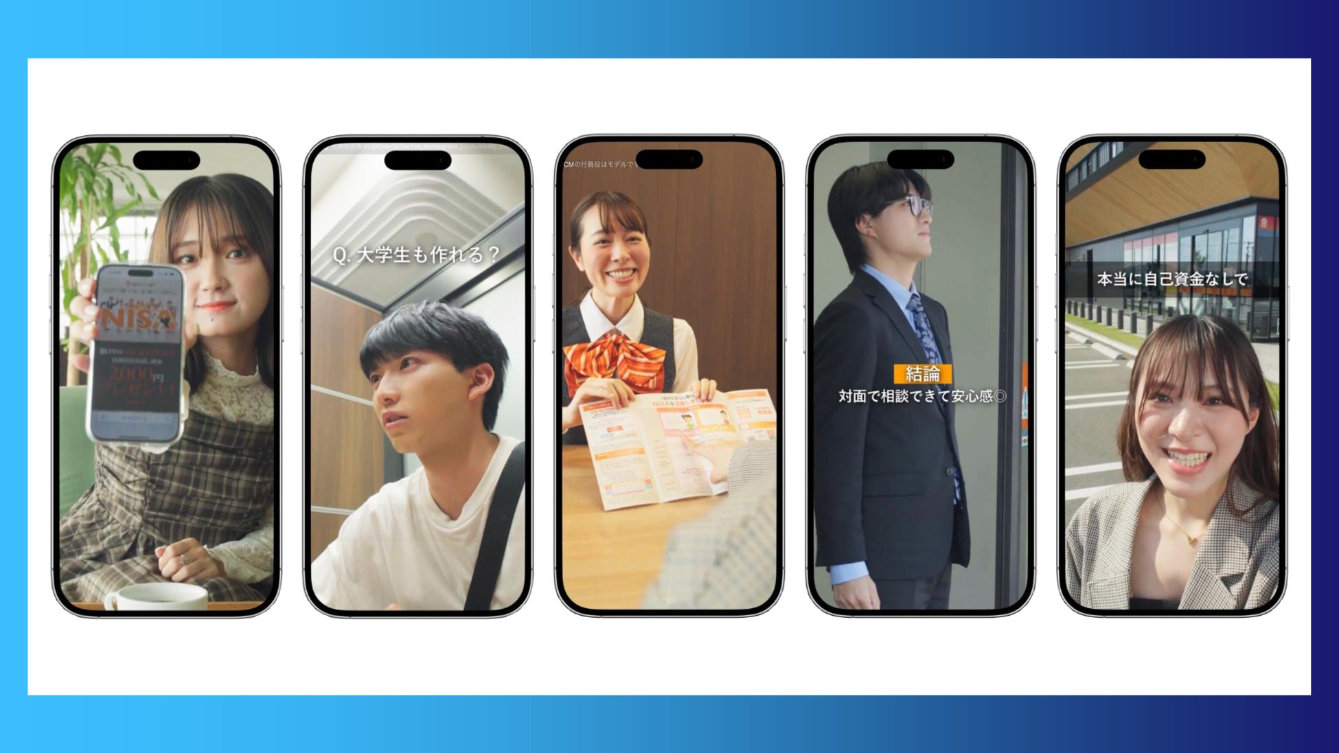 出演者は、いわゆる金融系インフルエンサーではなく、等身大の“生活者”としての視点を持つ若者たち。NISAの仕組みを論理で解説するのではなく、「実際に銀行に行って、どうだったか」「NISAってなにから始めればいい?」といった“体験”を通じたストーリーで構成されています。