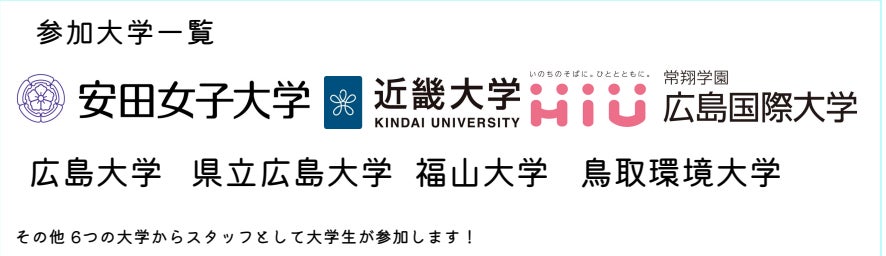 安田女子大学、近畿大学、広島国際大学、広島大学、県立広島大学、福山大学、鳥取環境大学、その他6大学から大学生がスタッフとして参加予定です。学部・学科も、理学、工学・情報、農学・環境、教育・心理、経済・経営・地域、医療・薬学、デザイン・映像、観光・国際など幅広い分野をカバーしており、高校生が関心分野ごとに大学を比較しやすい構成となっています。
