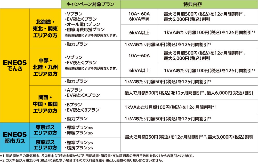 本キャンペーンでは、期間中、新規お申し込みの方を対象に、「ENEOSでんき」では、電気料金が最大6,000円割引に、「ENEOS都市ガス」では、ガス料金が最大3,000円割引になります※2。
