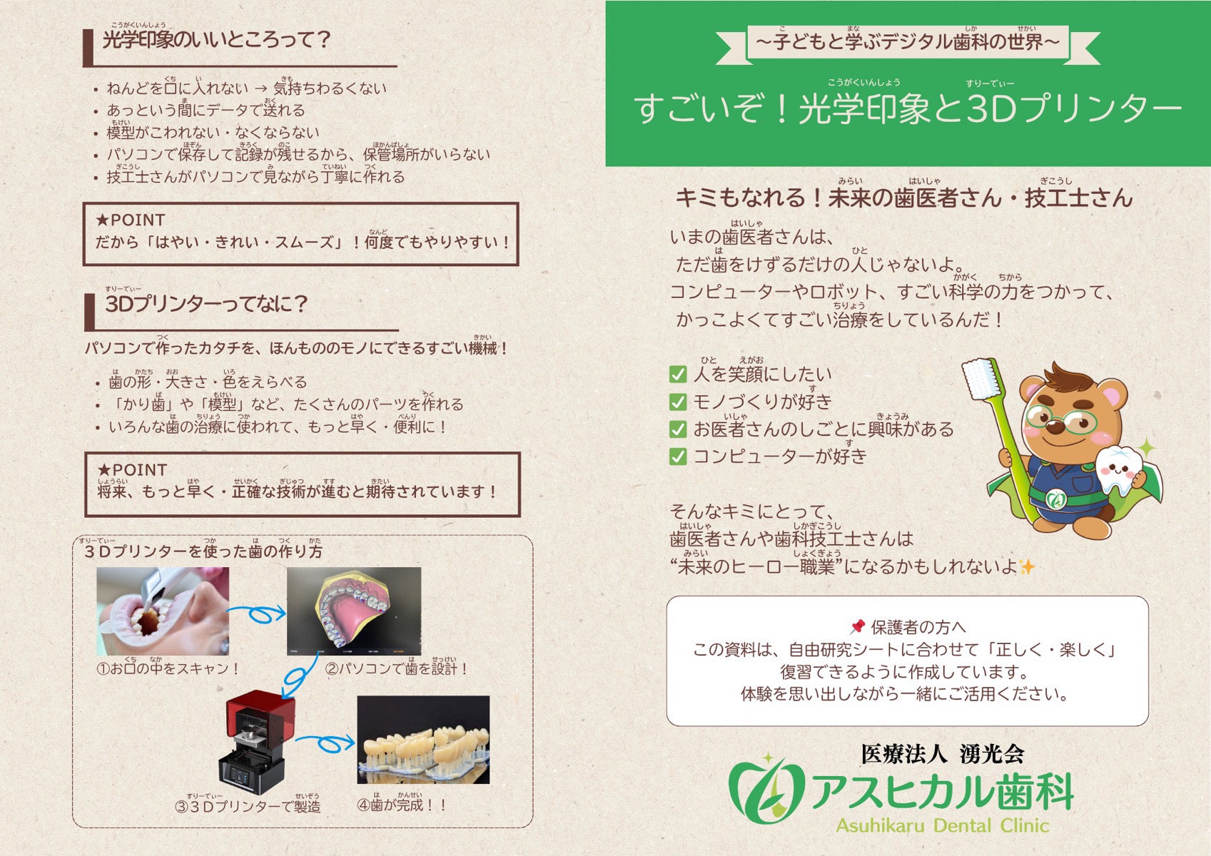また、歯科医療が持つ「医療×IT×ものづくり」という先進性を体験してもらい、将来的な興味・関心へとつなげるねらいもあります。特に近年注目されている STEM教育(科学・技術・工学・数学) の視点を意識した体験設計により、子どもたちが“考えて学ぶ力”を自然に育む機会となることを目指しています。