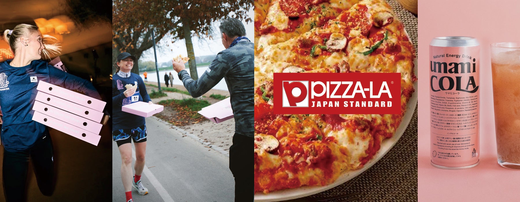 宅配ピザ「PIZZA-LA」とのコラボイベントで、2人1組のチームレース。各チームはチェックポイントでピザを1枚ずつ受け取り、フィニッシュライン通過時までに両方のピザを完食しつつ、空のピザ箱2つを手に持って完走となります。イベント終了後は「UMAMI COLA」で乾杯!