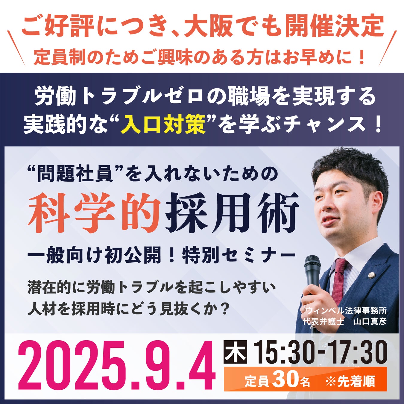ウィンベル合同会社(福岡市博多区、代表:弁護士 山口真彦)は、福岡・大阪開催の「労働トラブルを未然に防ぐ科学的採用術特別セミナー」への申込数が50人を突破したことを発表しました。