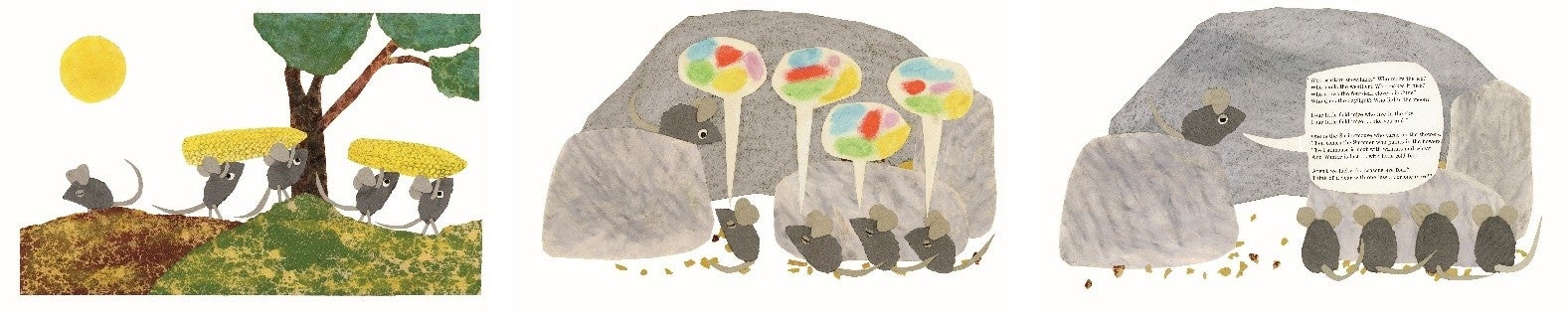 冬に備えて一生懸命食料を集める野ねずみたち。ところがそんな仲間たちをよそに、フレデリックはぼんやりとするばかり。フレデリックはまったく別のもの、おひさまの光や色、言葉を集めているというのです。いざ冬をむかえ、寒さに震える仲間たちに、フレデリックは集めたものたちを詩として届け、生きる喜びを教えるという物語です。