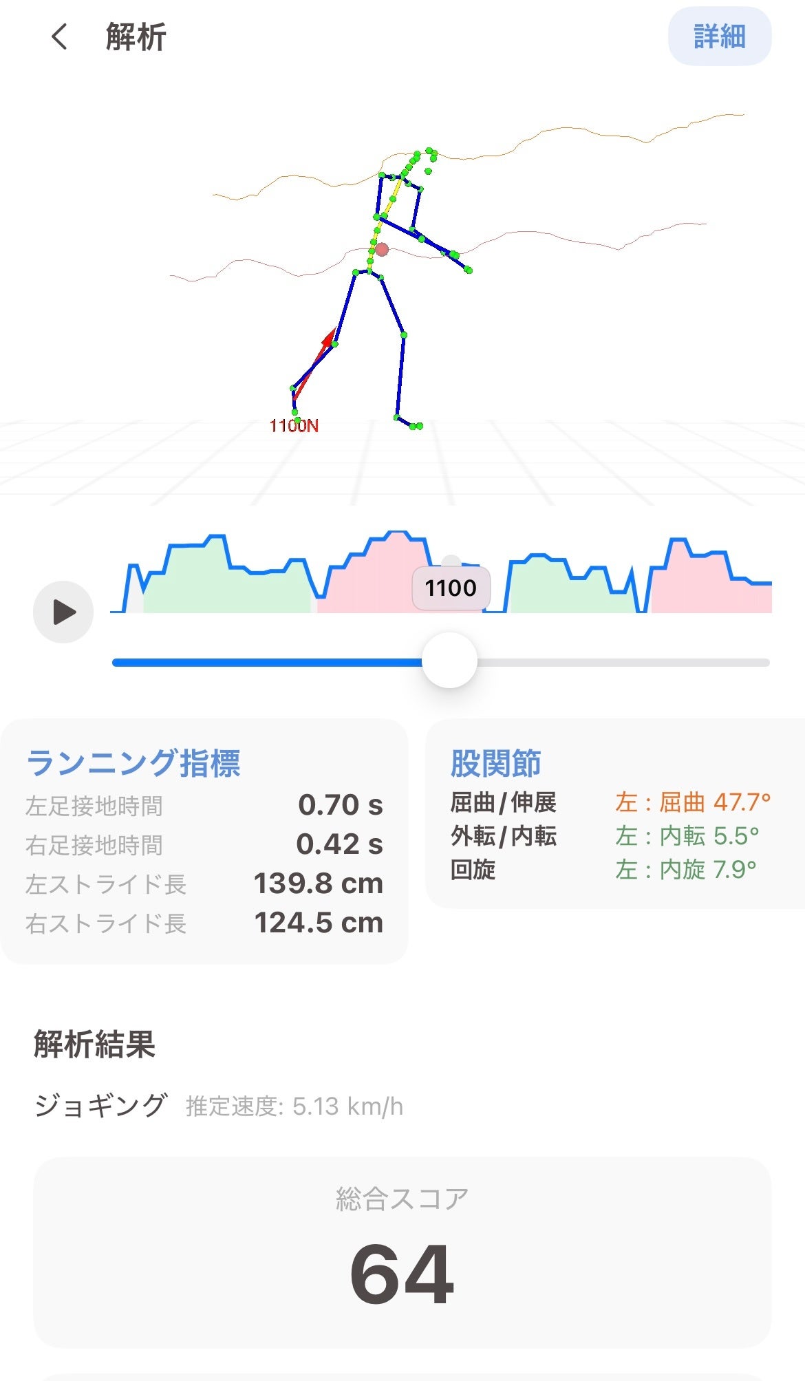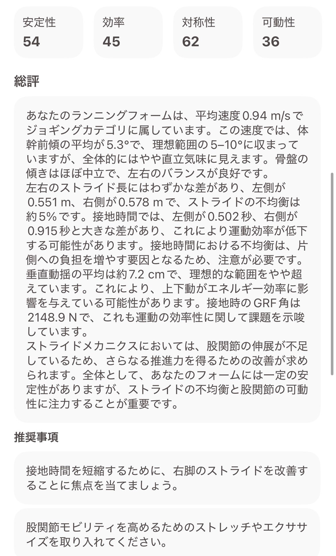 「RUN!」スマートフォンで撮影したランニング動画から、3D姿勢/動作解析を行い、フォームの癖・左右差・接地時間・重心位置・ストライド長・床半力・関節角度などを定量化。得られた数値をもとに、姿勢・バランス・推進力・モビリティの4カテゴリでスコアリングを行い、走りの特徴と改善点を明確にします。
