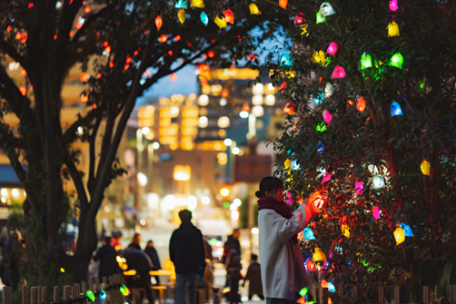 「ひかりの実」は、美術家・髙橋匡太さんの参加型アート作品で、地元の子どもたちや観光客、一般参加者が果実袋に大切な人の笑顔を描き、袋の中に入れたLEDライトで光る実を公園内の木々に飾ります。個性豊かな色とりどりの光が一帯を包み込み、幻想的な光景が広がります。子どもたちや参加者が描いた愛らしい絵に囲まれながら、夜の道後散策をお楽しみください。
