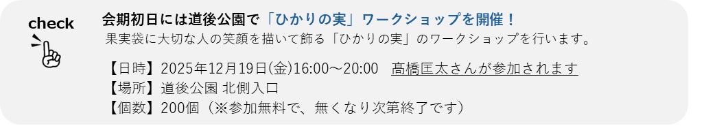制作された方や鑑賞される方の心に温かく残るものとして親しまれ、道後の冬の風物詩ともなっている参加型アート作品「ひかりの実」を、2025年12月19日(金)から2026年1月18日(日)まで道後公園で開催し、道後の冬を彩ります。