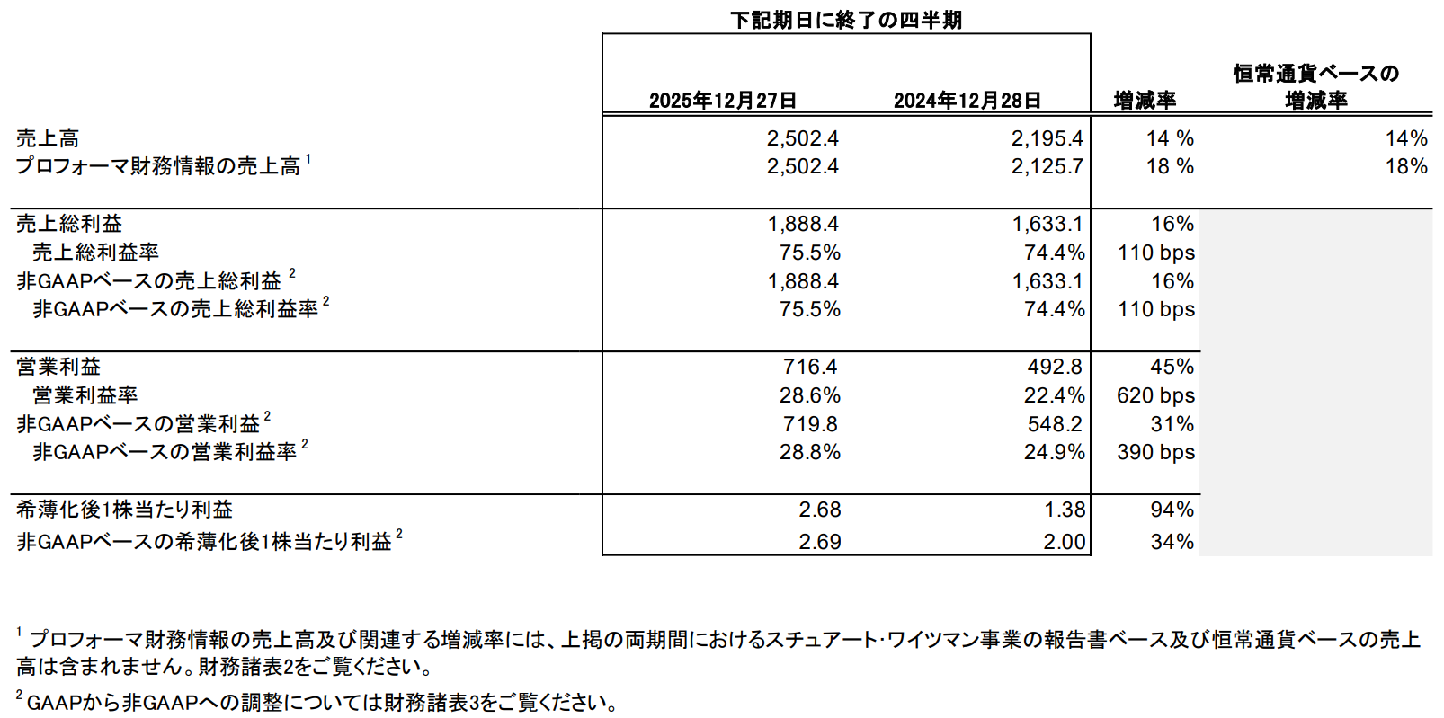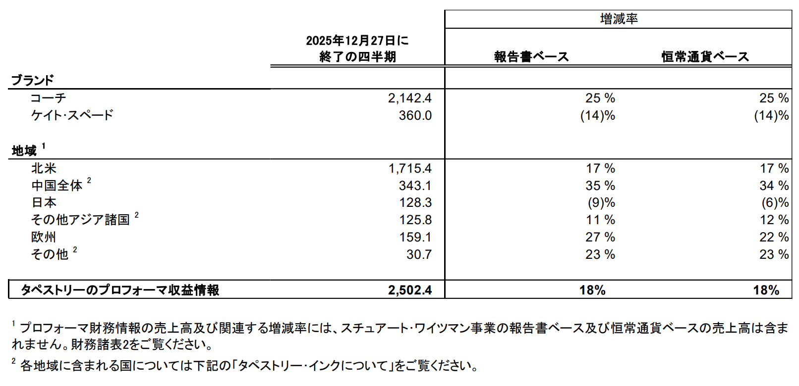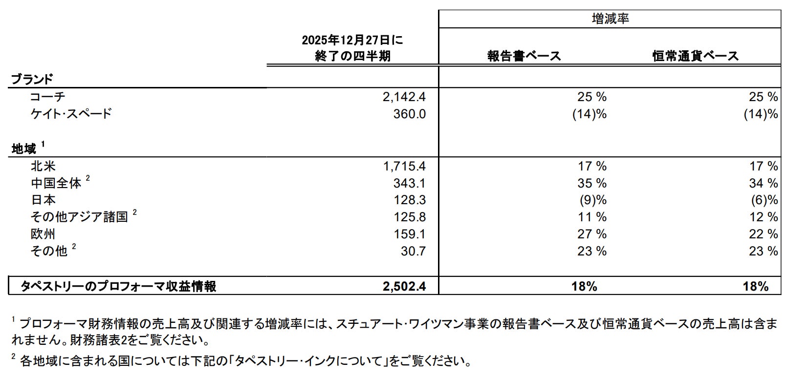 なおスチュアート・ワイツマン ブランドの売却は2025年8月4日に完了しており、2026年度の所有期間における当該ブランドの業績は、GAAPベースでは2026年度第1四半期及び年初来の業績に含まれていますが、非GAAPベースでは年初来の業績から除外されています。