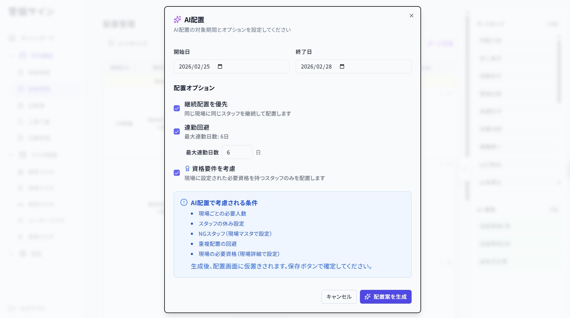 隊員の資格・休日希望・現場の必要人数・連続勤務制限をAIが自動で考慮し、最適な配置案を作成。管理者は確認・微調整するだけで済みます。