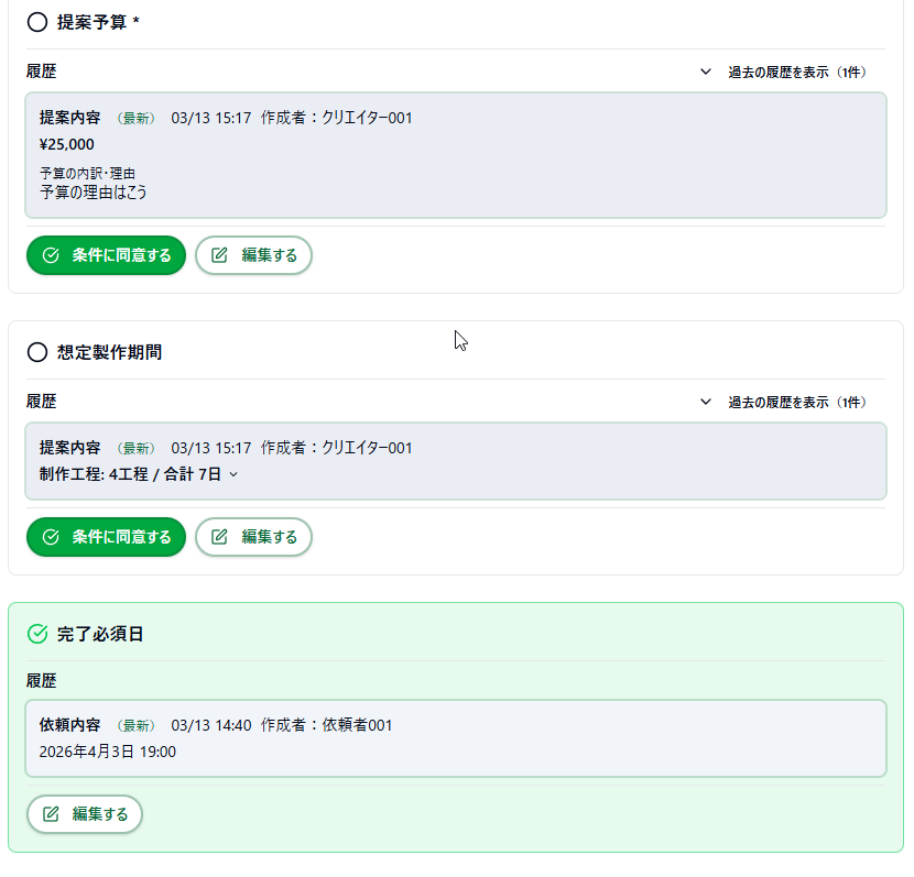 また、成約時にはクリエイターと相談しながら、【成約フォーマット】の内容をいつでも確認・編集することが可能です。