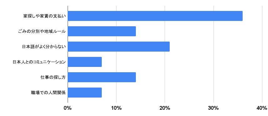 また、「日本で困っていること」として最も多かったのは「家探しや家賃の支払い」でした。住まいは生活の基盤であり、外国人が安心して暮らすための最も重要な要素です。