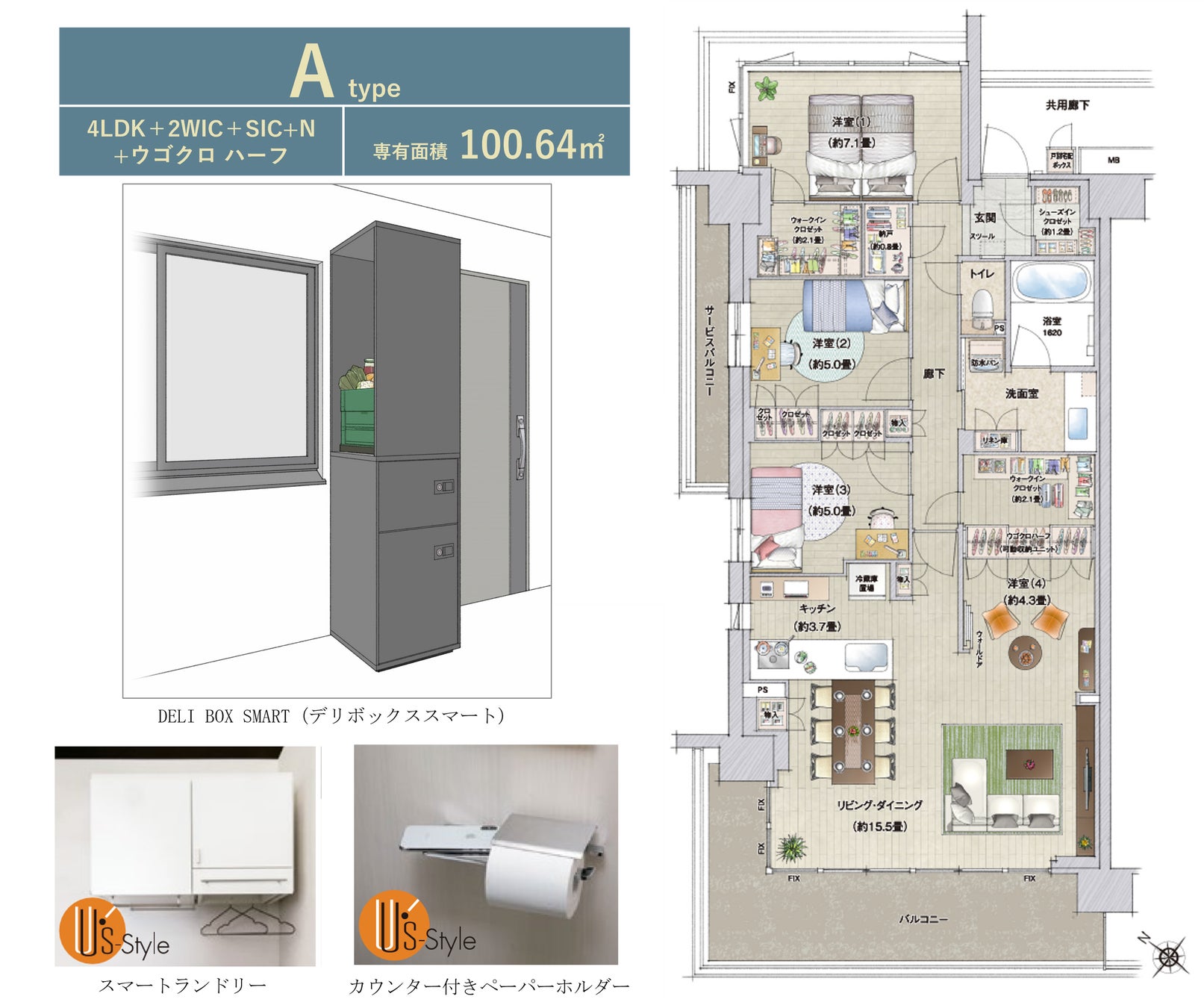本物件では2LDK 73.11㎡~4LDK 100.64㎡まで全10タイプのプランバリエーションをご用意し、玄関横には宅配業者が伝票番号を解除キーとして荷物を届ける「DELI BOX SMART」を全住戸に採用しております。専有部では、長谷工アーベストの女性スタッフを中心に「あったらいいな」をカタチにしたオリジナル仕様「U‘S Style(ユーズスタイル)」から、「スマートランドリー」、「カウンター付きペーパーホルダー」等を採用しました。キッチンには長谷工コーポレーションとタカラスタンダードが共同開発した新発想の「フレタスキッチン」を設置しました。また、シューズインクロゼット(SIC)から直接洗面室に行けるSICダイレクト洗面室プランや家族の動線に配慮した洗面・脱衣室分離プラン、アウトドア用品を置ける土間プラン、キッチンスペースを広く確保したキッチンアトリエプランなど個性豊かな間取りプランをご用意しました。