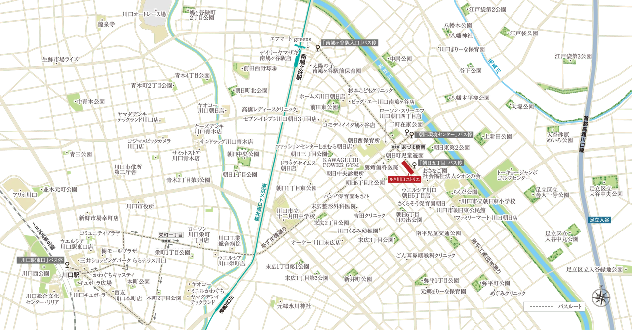 JR京浜東北線「川口」駅バス約18〜20分、「朝日環境センター」バス停徒歩4分 埼玉高速鉄道埼玉スタジアム線「南鳩ヶ谷」駅 徒歩15分 |