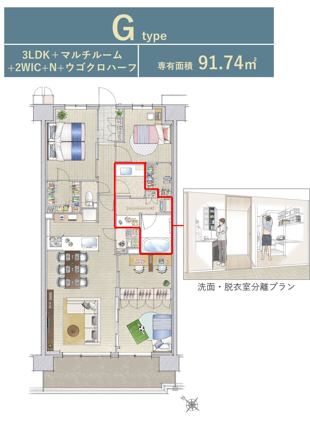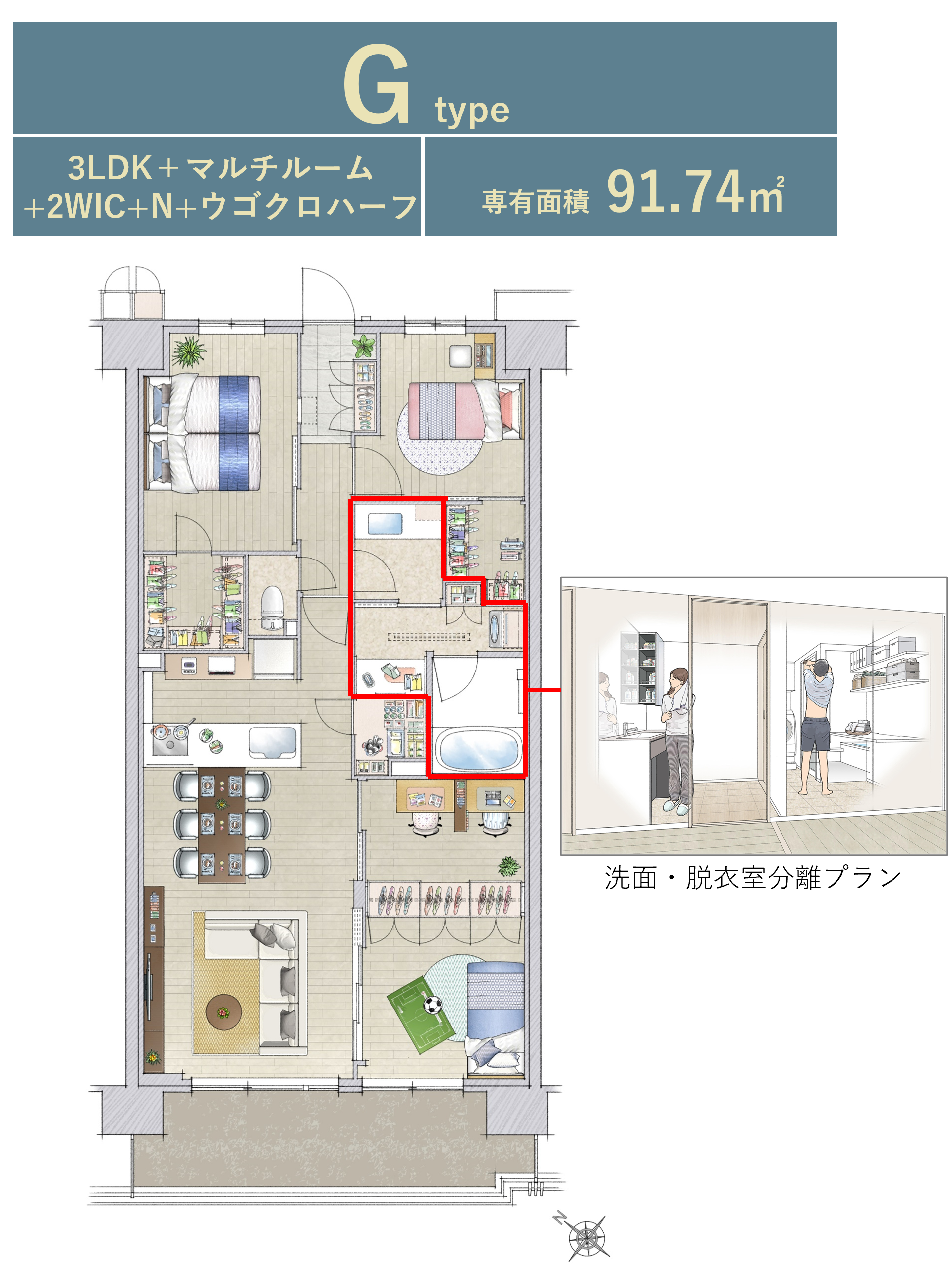 本物件では、全住戸に長谷工グループが独自開発した可動収納ユニット「UGOCLO Plus(ウゴクロ プラス)」(2列可動)、「UGOCLO S(ウゴクロ エス)」(1列可動)、「UGOCLO Half(ウゴクロ ハーフ)」(1列可動・通り抜け可)を全住戸に採用しています。子供の成長などライフスタイルの変化に応じての広さを変更したり、テレワークスペースにしたりと空間の自由度を高めることができます。