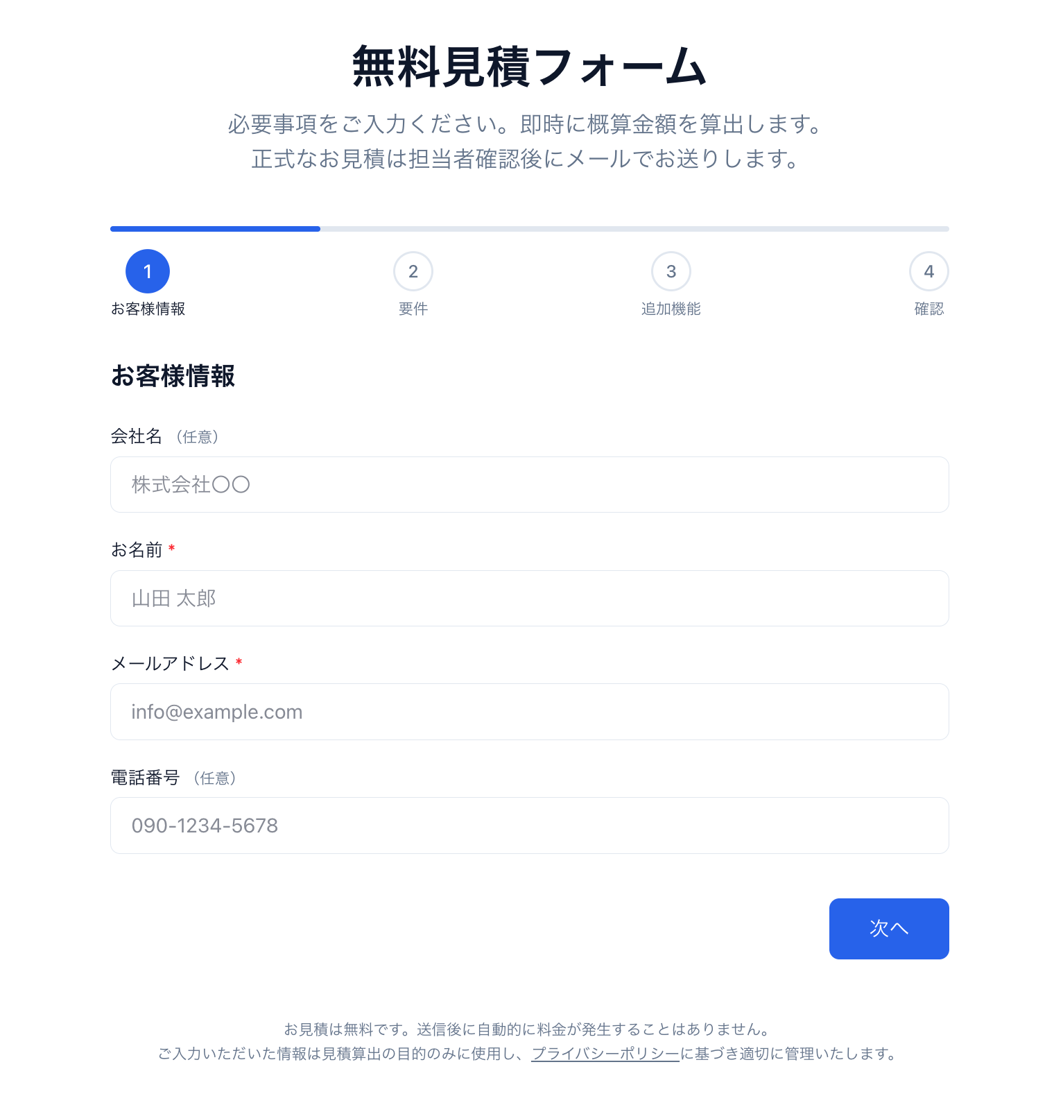 Webフォームからサイトの種類、ページ数、必要な機能をご入力ください。概算金額を即時にご確認いただけます。