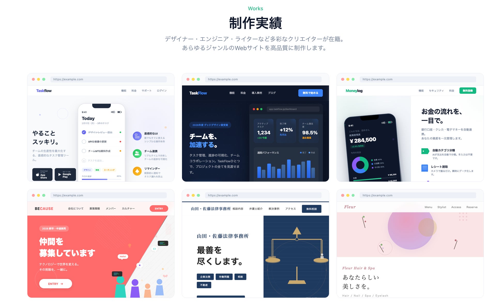 コーポレートサイト/ランディングページ/ECサイト/採用サイト/ポートフォリオサイト/ブログ・メディアサイト/サービスサイト/ブランディングサイト/サイトリニューアル/WordPress制作