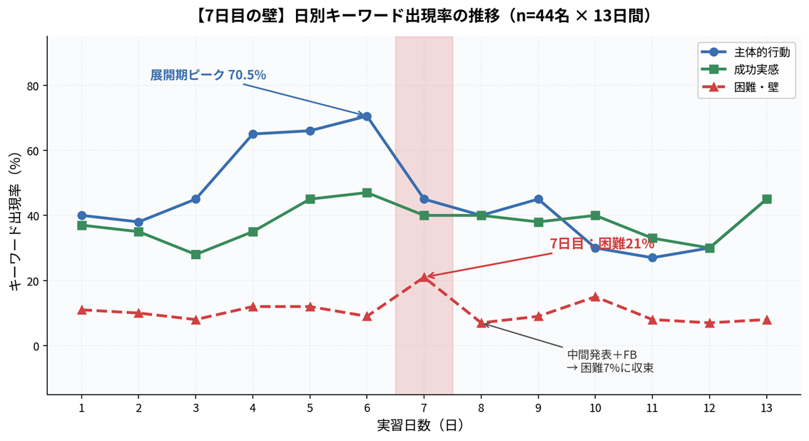 ①「7日目の壁」──プロジェクト開始4〜6日目に主体的行動がピーク(70.5%)に達した直後、7日目に「困難」キーワードが21%まで急上昇。8日目の中間フィードバックで7%まで収束します。誰が声をかけるかで定着が決まる分岐点であることが判明しました。