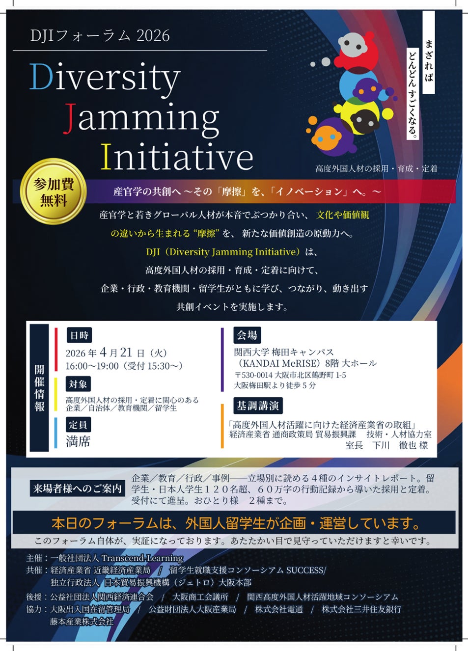 一般社団法人Transcend-Learning(本社:大阪府、代表理事:吉田 圭輔)は、本日2026年4月21日(火)16時より、関西大学梅田キャンパス(KANDAI MeRISE)8階 大ホールにて、産官学共創フォーラム「DJIフォーラム2026 ─ Diversity Jamming Initiative ─」を開催いたします(参加費無料・定員満席)。経済産業省による基調講演に加え、9か国・13大学・延べ120名超の学生(外国人留学生が中心)による約60万字の行動記録を分析した『DJI INSIGHT REPORT(企業/教育/行政/事例の全4種)』を本日公開。来場者には無料進呈いたします。