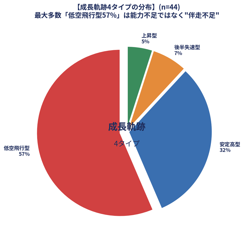 ②「低空飛行型」57%の正体──学生の成長軌跡は4タイプに分かれ、最大多数の57%は能力不足ではなく"伴走不足"が原因です。企業が社員面談や現場見学などに積極関与した場合、低空飛行型の発生率は8%まで低下します。