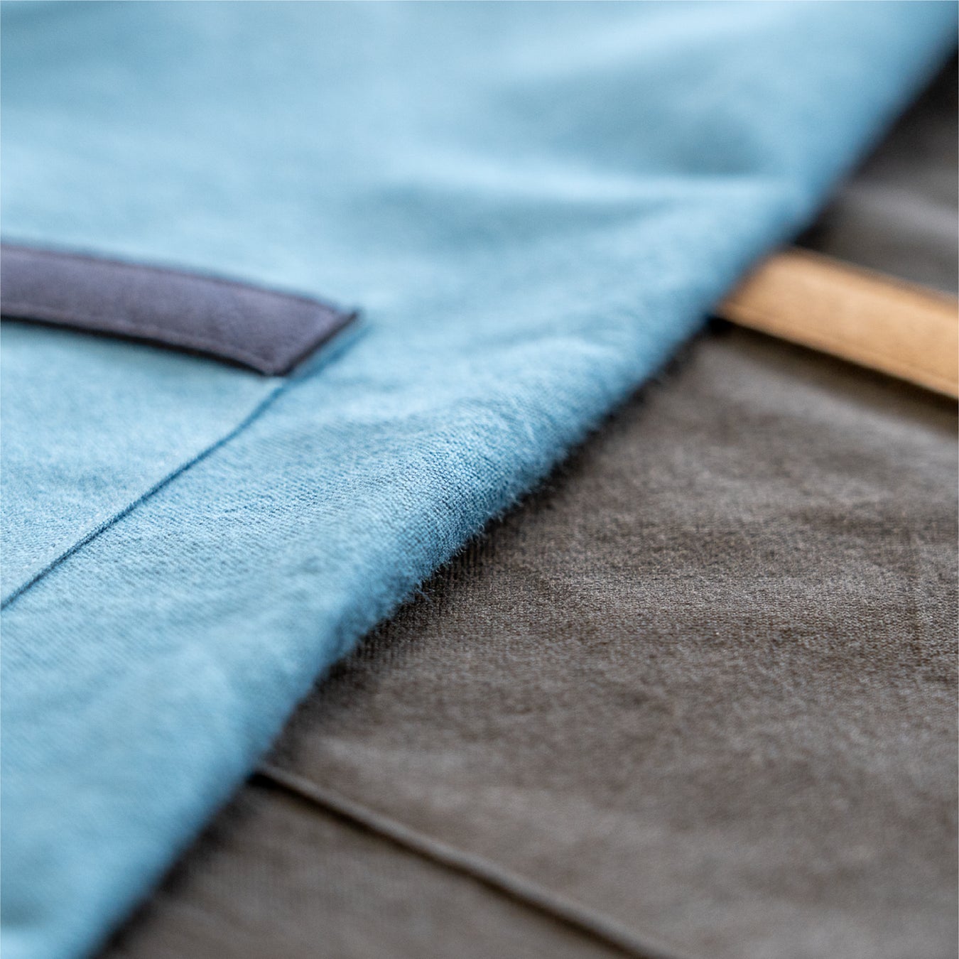 首紐、3本ループは、日本製のスエード調人工皮革を使用。スエードのような質感でありながら、素材自体が軽量で洗うことができ、シワになりにくいという機能性もあります。エプロンを作る上で、デザイン性・質感・機能性が揃う最高の条件です。