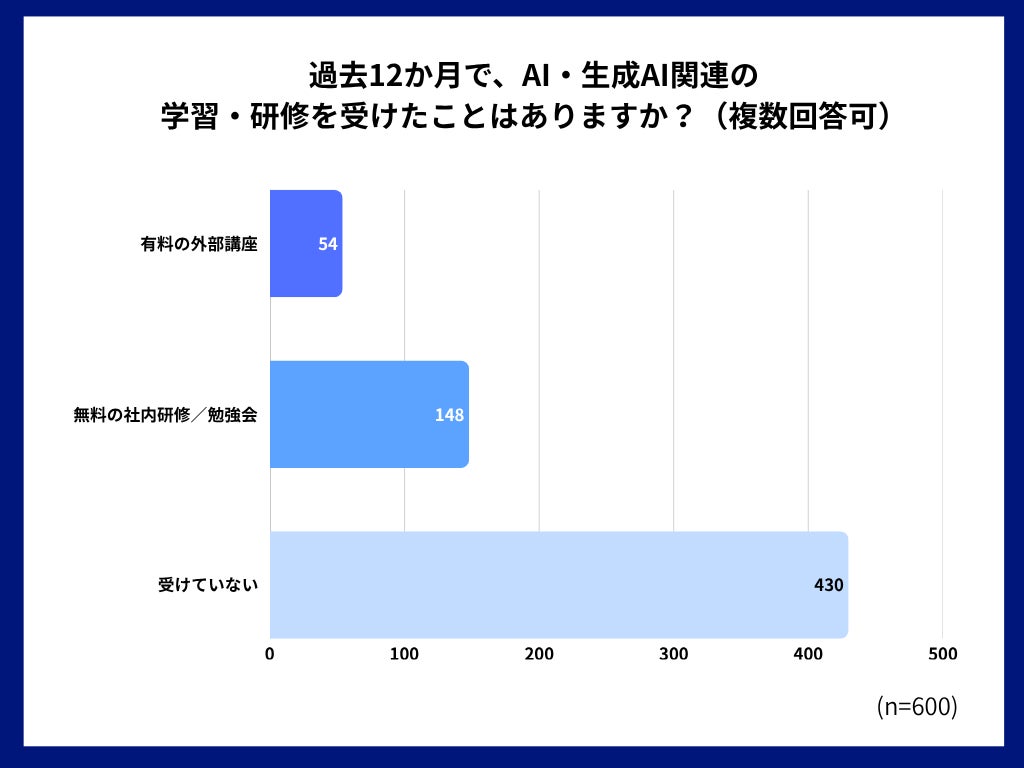 直近12か月でAI学習・研修を受けたか聞いたところ、「受けていない」が71.7%(430人)で最多でした。