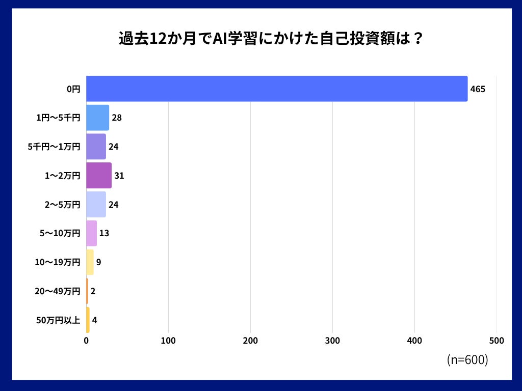 過去12か月でAI学習に自己投資を行った割合は約22%で、600名中465名は、費用をかけた学習はしていませんでした。費用をかけた学習を実施した人の内訳は「1〜2万円未満」31人、「2〜5万円未満」24人、「5千〜1万円未満」24人。 中には50万円以上の投資を行った人も4名いました。