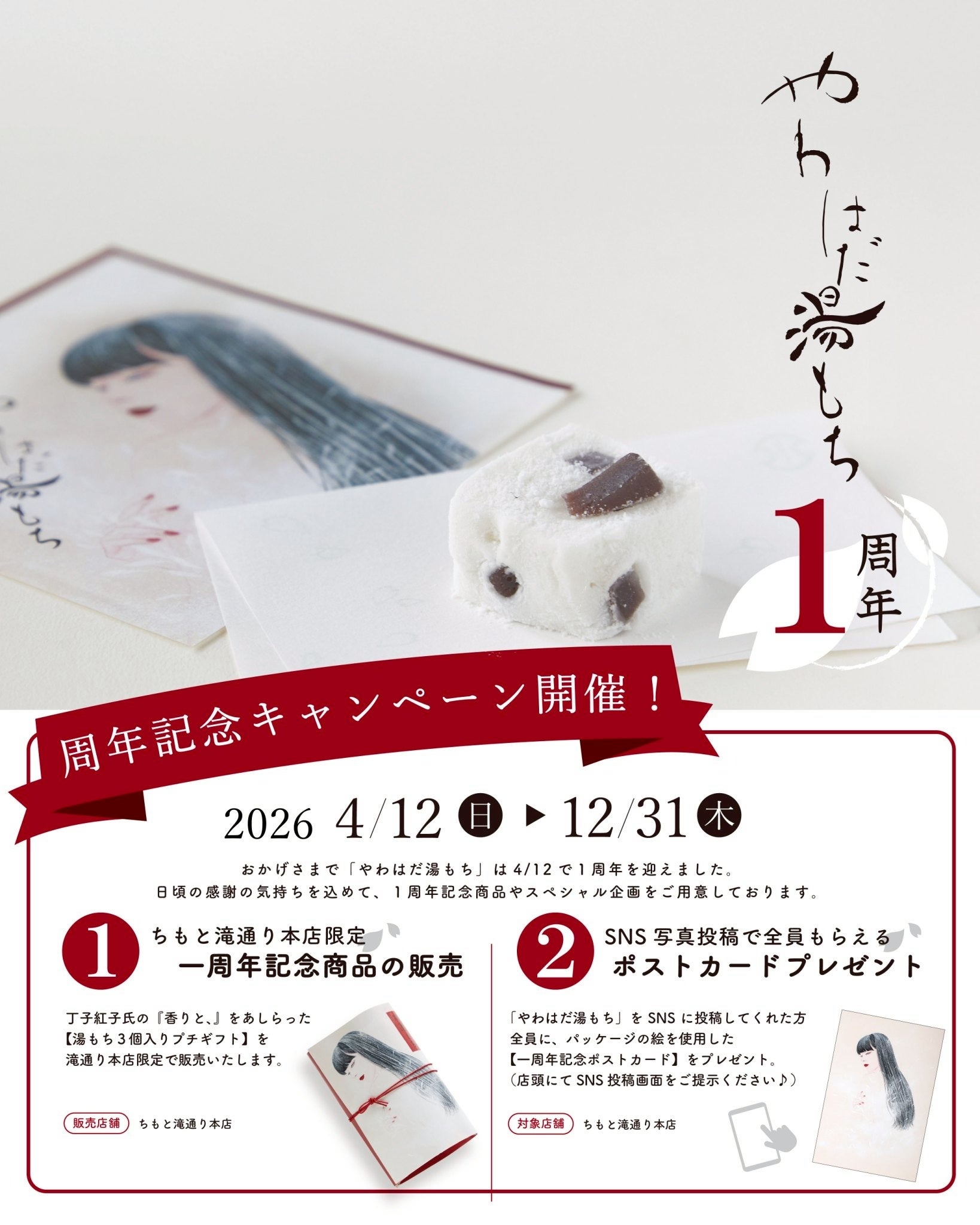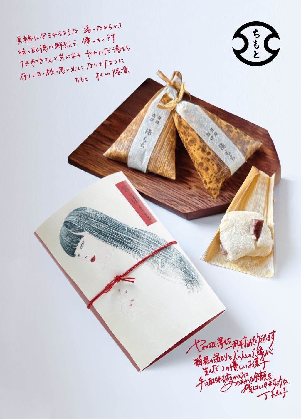 箱根湯本で和菓子の製造・販売を行う有限会社ちもと(神奈川県足柄下郡箱根町、代表取締役:杉山隆寛)は、2026年4月12日に、ちもと滝通り本店にて大変ご好評いただいている「やわはだ湯もち」の発売1周年を迎えます。これを記念し、4月12日(日)~12月31日(木)まで、日本画家・丁子紅子氏が同商品のために描き上げた作品『香りと、』をあしらった、「湯もち3個入りプチギフト(税込940円)」を、滝通り本店にて1日20個限定で販売いたします。