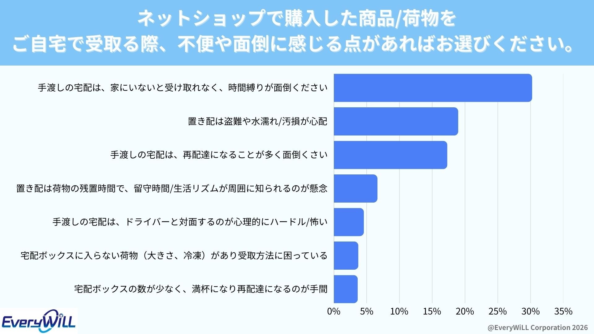 宅配サービス利用者に荷物の受取り時に不便・面倒等に感じる点を確認すると、「手渡しの宅配は時間縛りが面倒」という回答が約3割(30.1%)で最多となりました 。