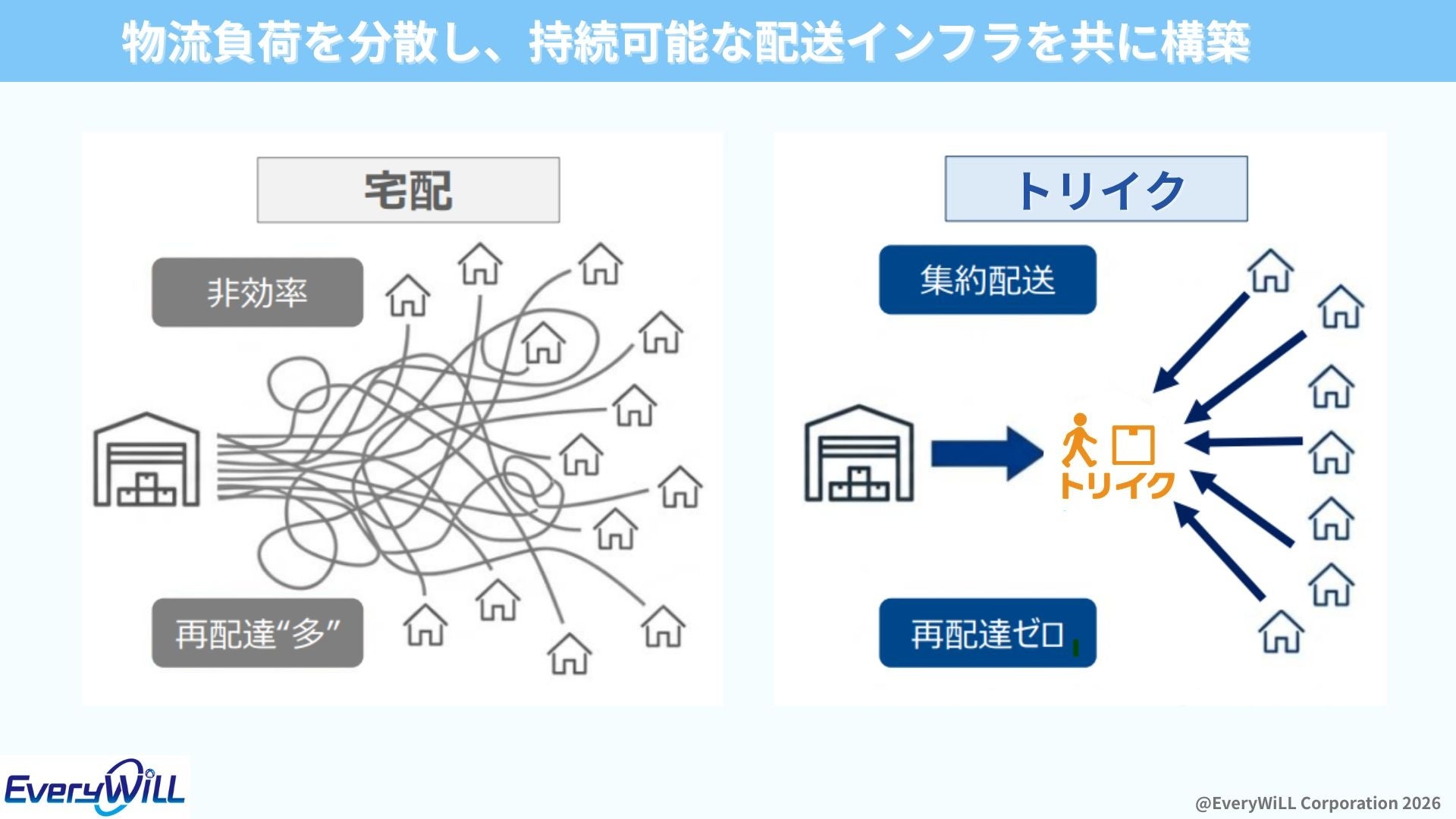 社会的な意義: 宅配ドライバーの業務負荷を軽減し物流インフラの持続性を高めること、配送車両の走行距離逓減による温室効果ガスの削減に加え、店舗や集合住宅や公共施設等の未利用スペースの有効活用、地域活性化を同時に実現します 。