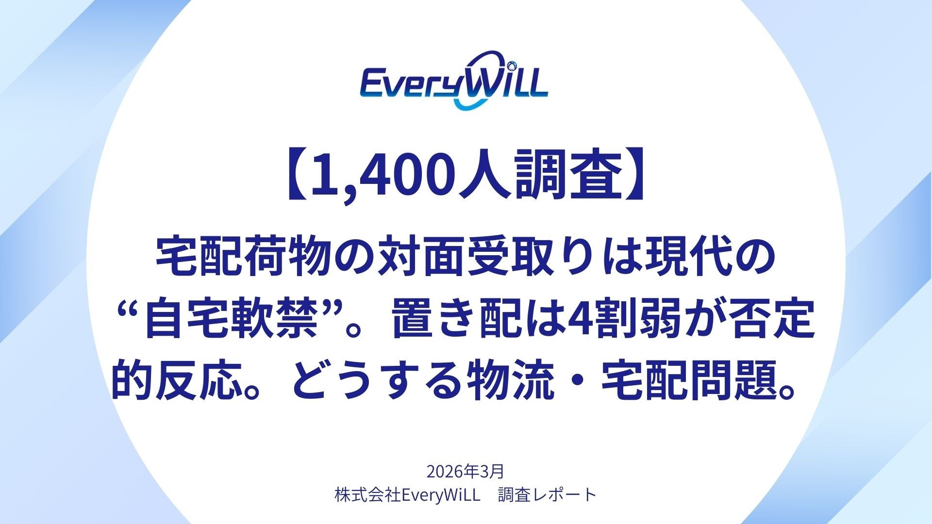 昨年、国土交通省の補助対象事業者*に採択された株式会社EveryWiLL(本社:東京都新宿区、代表取締役:須藤 俊明)は、某自治体と連携の上、東京都に住む1,400名を対象に「宅配サービスに関する意識調査」を実施いたしました 。