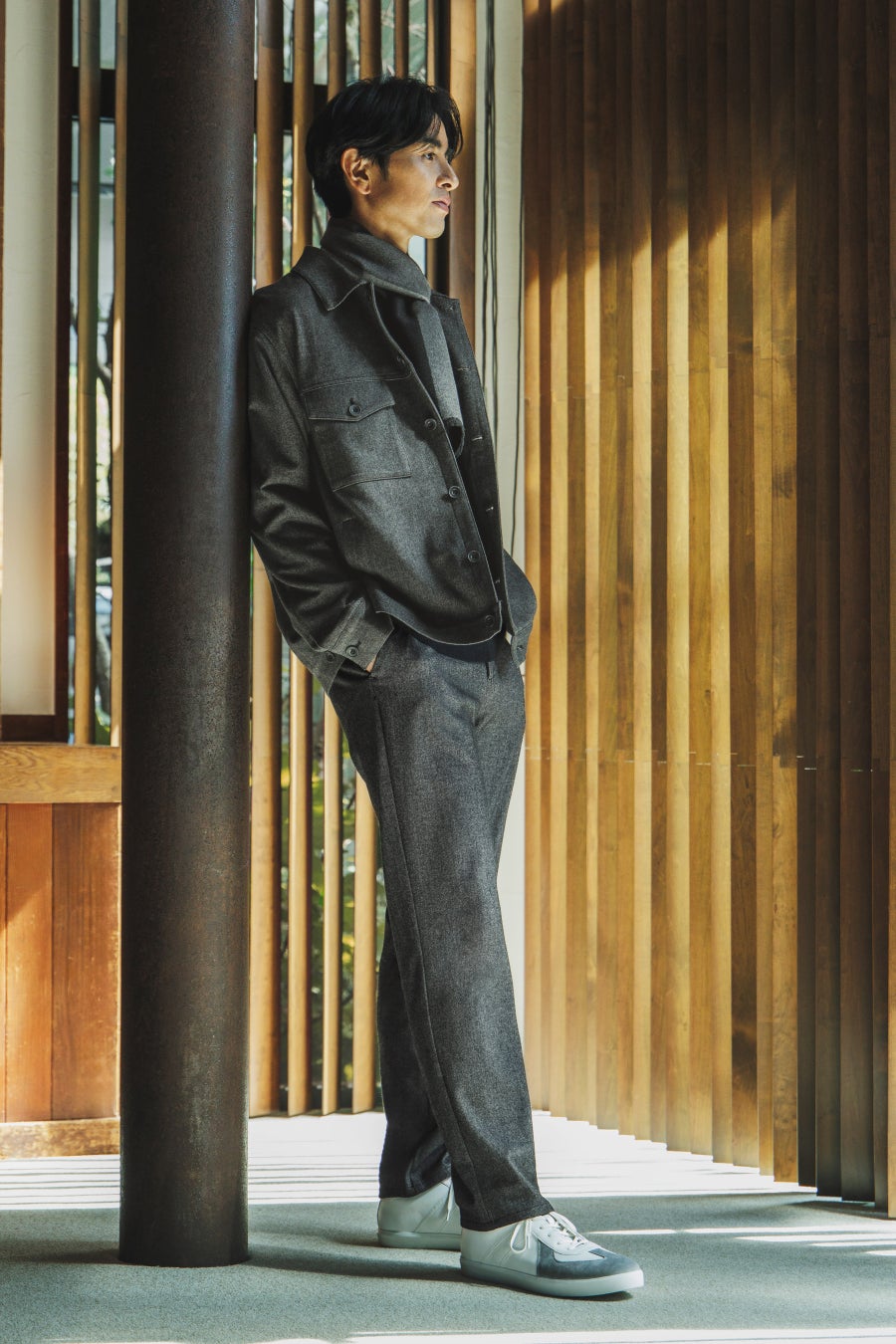 大人の余裕と品格を感じられるグレーのセットアップは、カジュアルなトラッカージャケットとトラウザーズが新鮮。