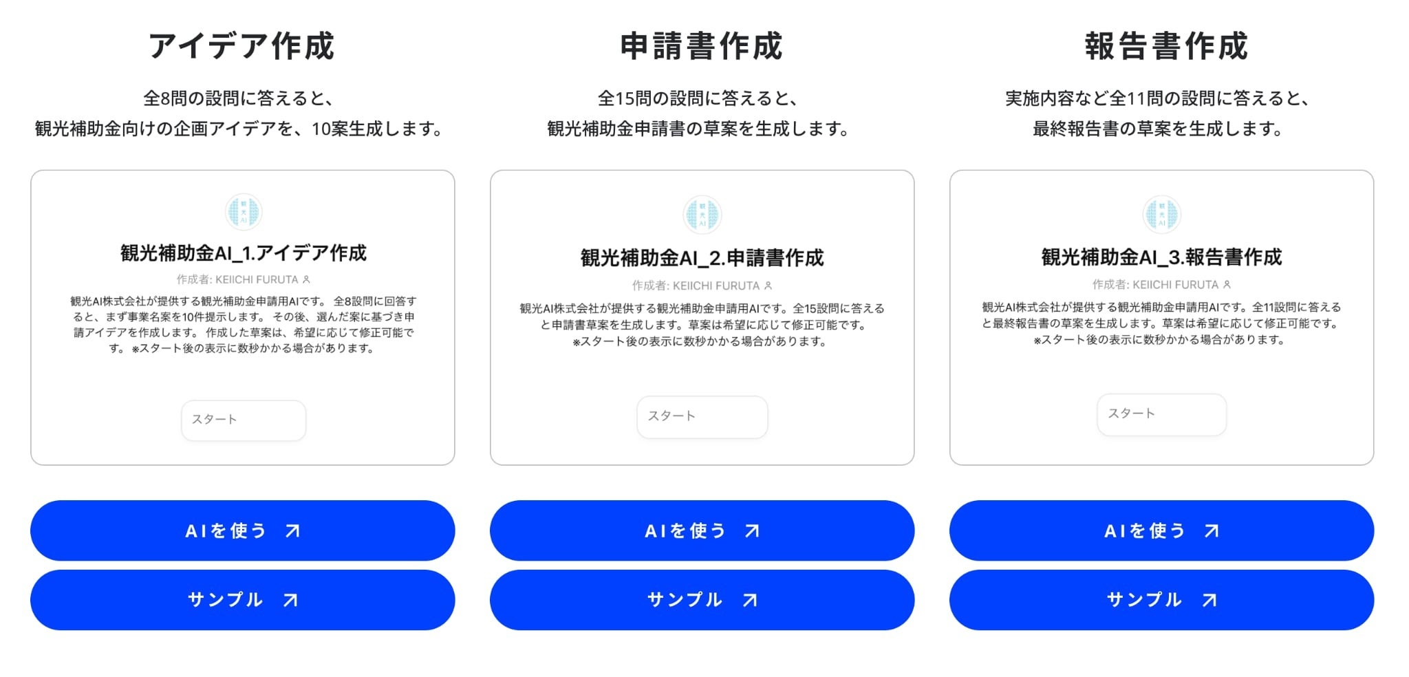 設問に答えるだけで、観光補助金の申請書草案を生成するChatGPTベースのAIサービス。共同申請や伴走支援にも対応。