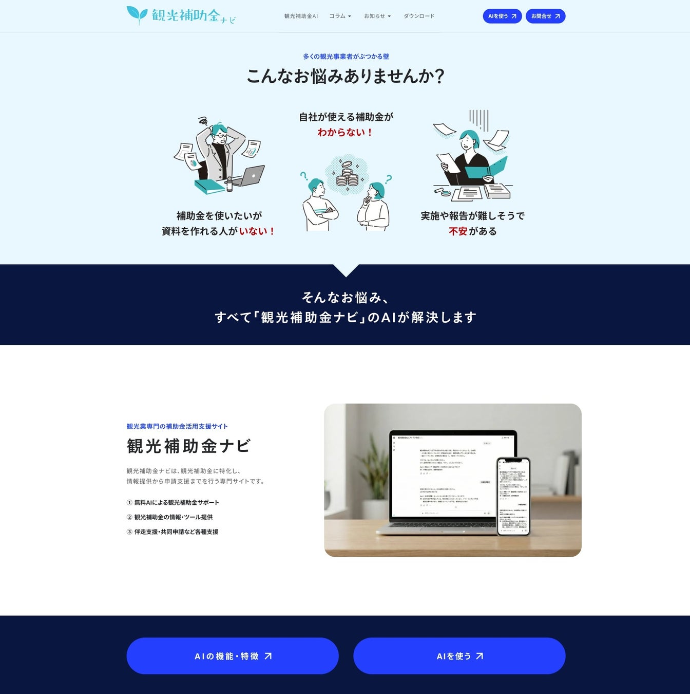 観光補助金AIの提供にあわせ、観光補助金に特化した情報サイト「観光補助金ナビ」も構築しています。