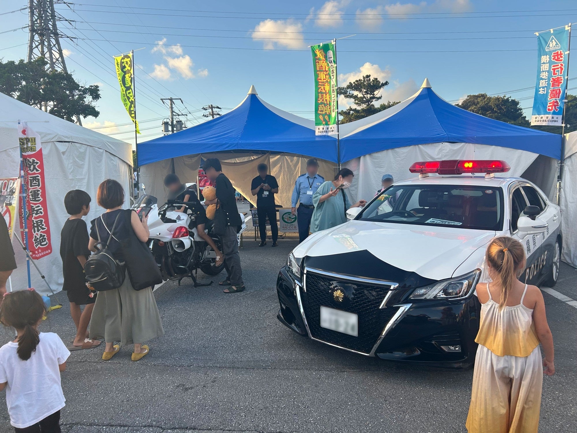 一般社団法人日本自動車連盟(JAF)の「子ども安全免許証」の発行や、警察署によるパトカー白バイ展示、消防車展示は子供達に人気となっており記念撮影をする様子が多く見られました。