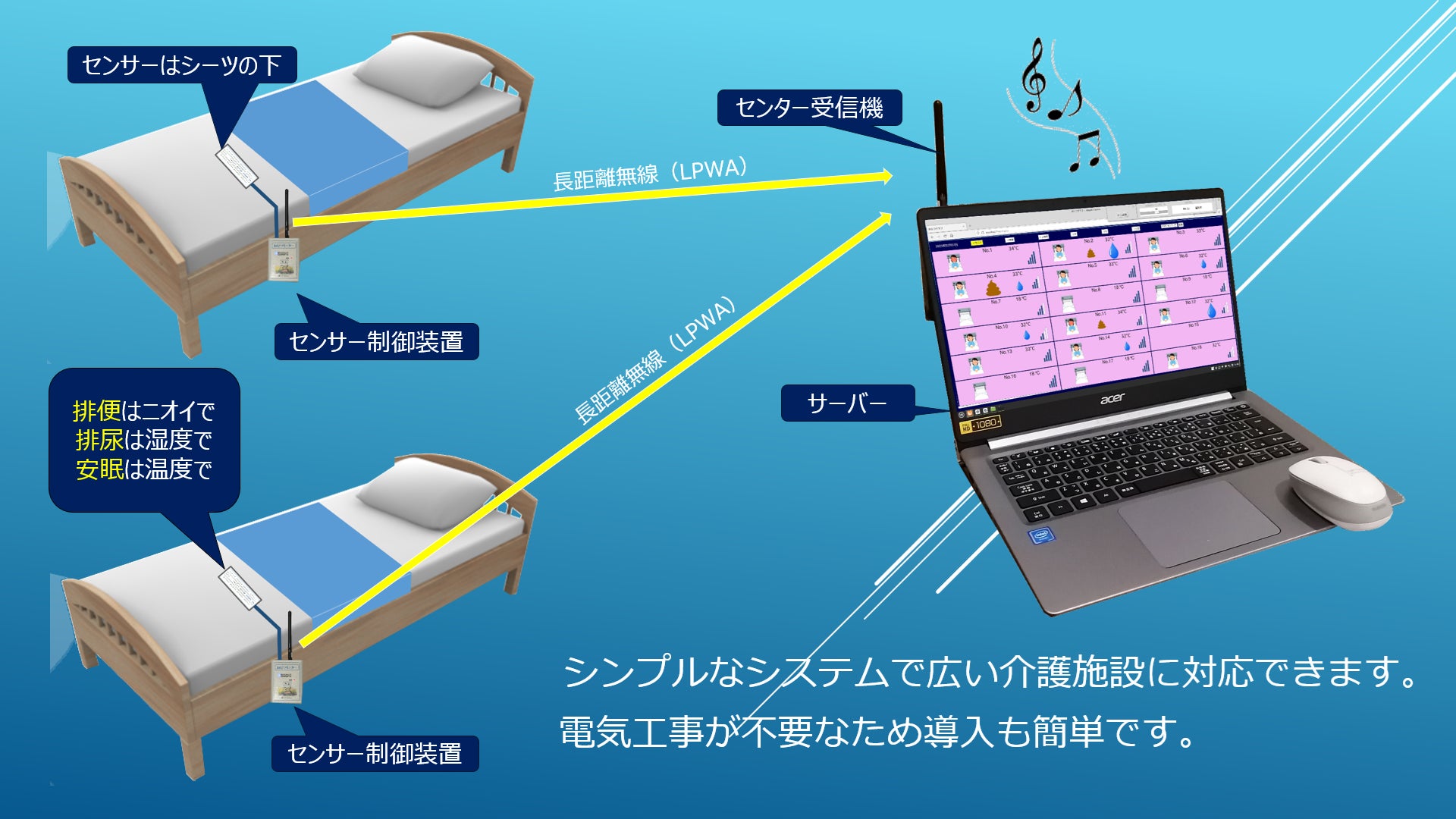 介護施設向けには、WiFiまたはLoRa(長距離無線)通信でナースステーションのPCやスタッフのスマートフォンに通知するシステム型製品もご用意しています。