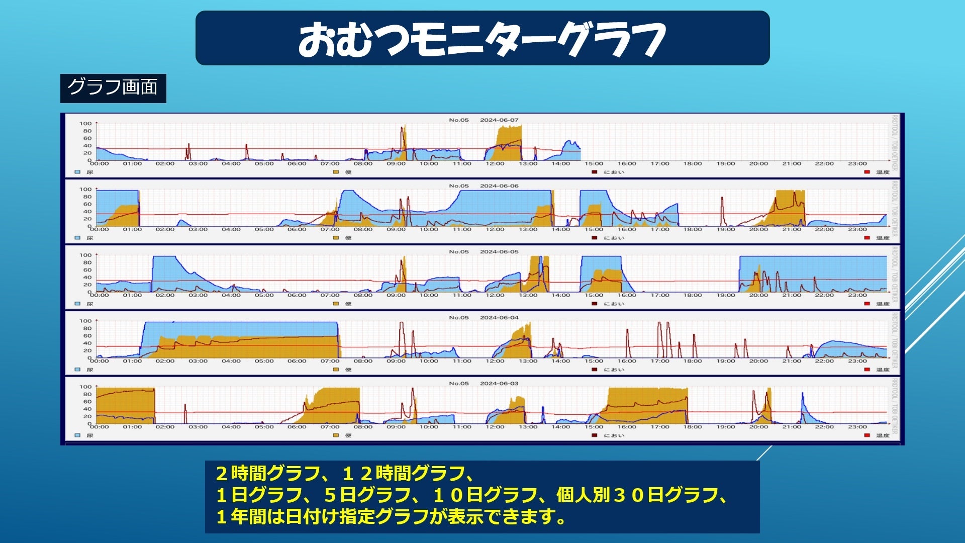 ネットワーク工事不要で施設側でシステム構築が可能です。排泄履歴の2時間〜1年間のグラフ表示にも対応し、個人の排泄パターンの可視化・記録自動化にもご活用いただけます。