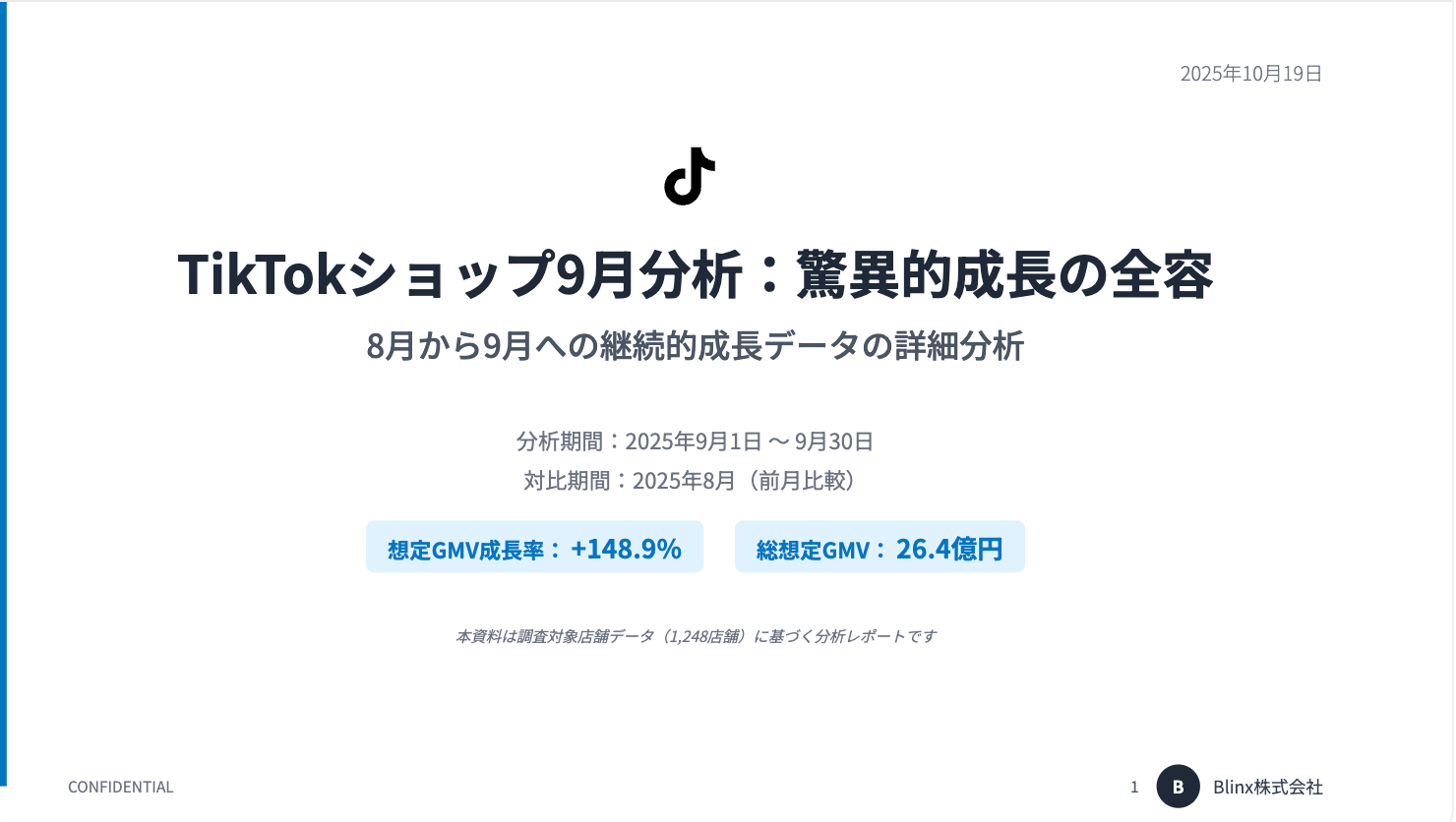 Blinx株式会社は、TikTok Shopの実績データ1,248社分をもとに9月の市場動向をまとめた「9月月間レポート(全54ページ・詳細分析付き)」を公開しました。GMV約26.4億円(前月比+148.9%)/販売112.9万件/平均単価2,171円と、"高単価×高収益"への転換が加速。上位300社のライブ採用率25%がGMVの36.4%を生み出す構造も判明しています。7月からわずか3ヶ月で市場規模が13.2倍に拡大した急成長市場の最新動向を、元TikTok for Business執行役員の知見に基づき徹底分析した業界随一の包括的レポートです。