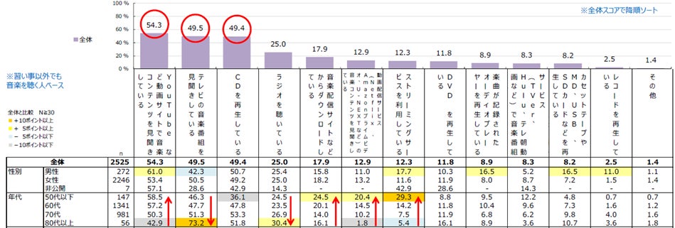 また、シニア層が普段音楽を聴く方法は「YouTube等の動画サイト」が54.3%で最も多く、従来の「テレビの音楽番組」(49.5%)や「CD」(49.4%)を上回る実態が明らかになりました。