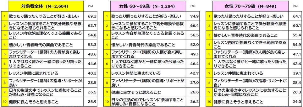 調査の結果、プログラム継続の目的は「歌ったり踊ったりすることが好き・楽しい」(69.2%)がトップで、音楽を通じた「気分転換・息抜き」(62.7%)や仲間との交流を求め、アクティブな生活を送るシニア像が浮かび上がりました。