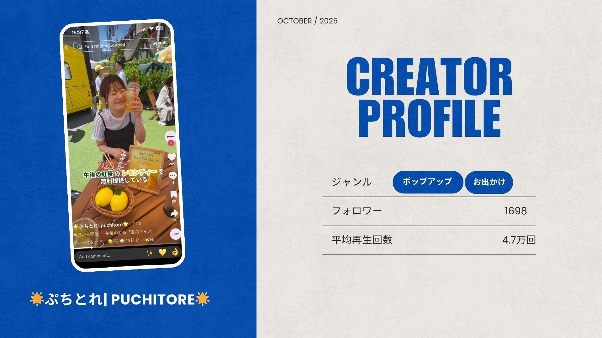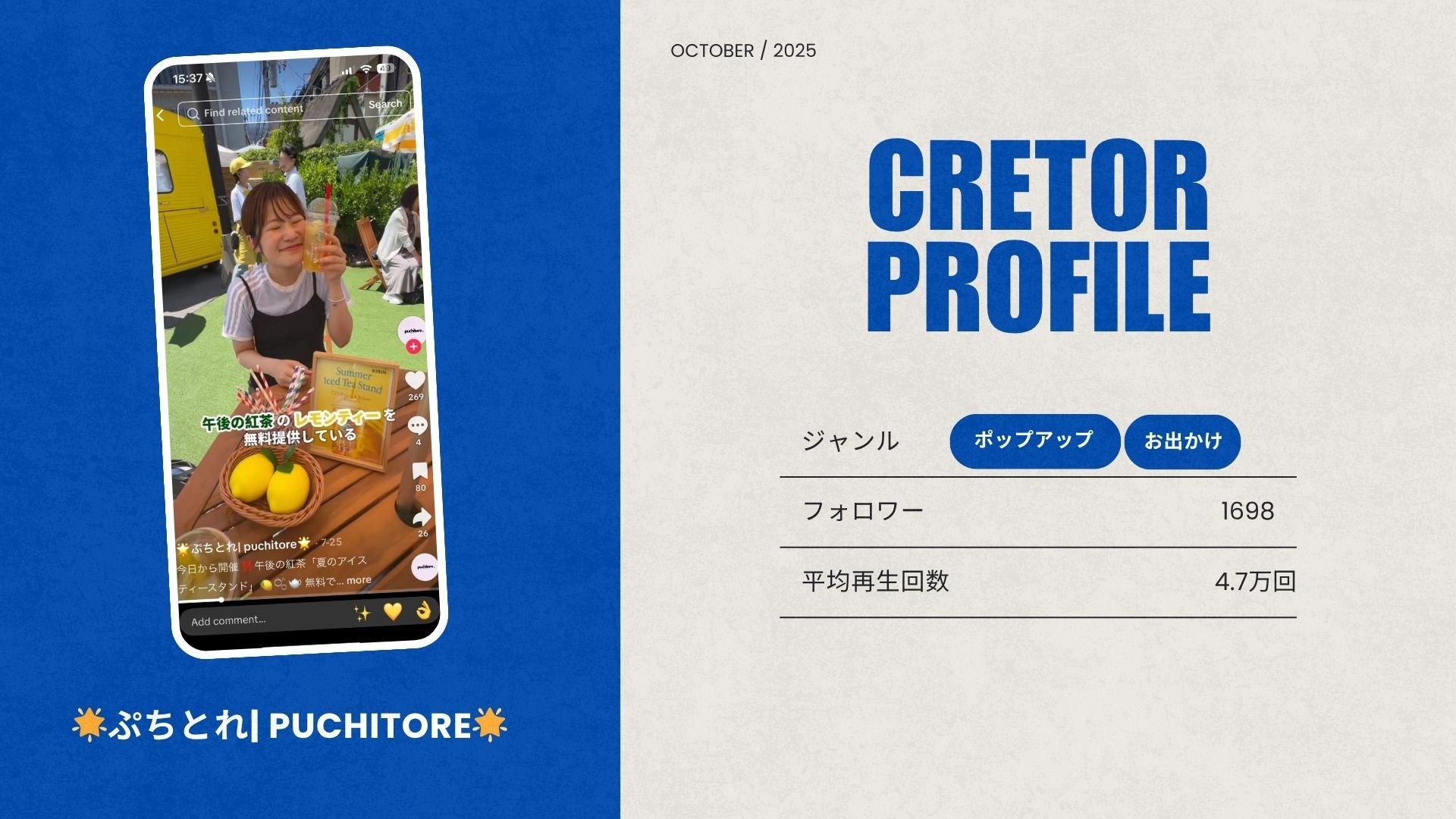 「🌟ぷちとれ| puchitore🌟」は、企業やブランドのポップアップイベントを中心に取材し、動画を制作・発信しています。これまでの投稿の中には、再生回数40万回を超える動画も。ポップアップやおでかけ分野に強みを持つ同メディアの加盟により、SNS上でのイベント認知や集客の効果がさらに期待できます。