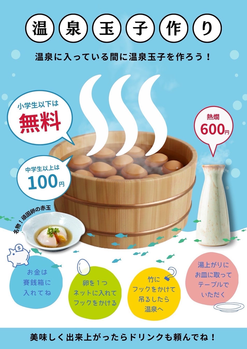 自分で温泉たまごを作り、湯上がりにその場で食べられる体験