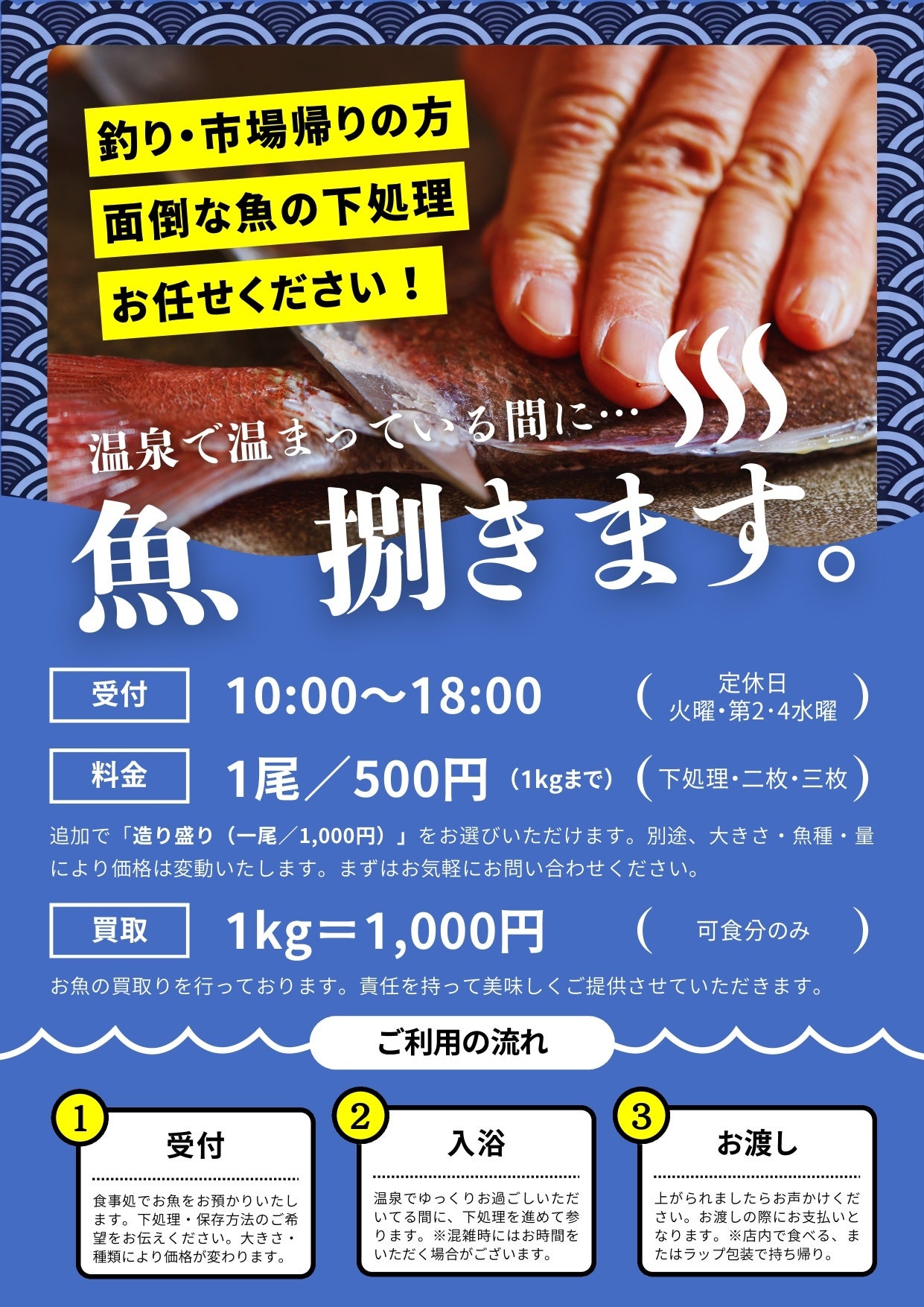 ※取材の場合は 魚捌きの様子、温泉入浴、提供シーンまで撮影可能です。