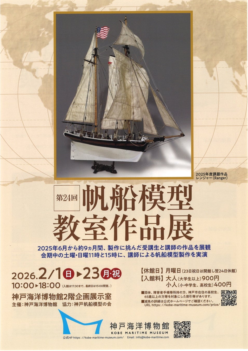 神戸海洋博物館では、2026年2月1日(日)から2月23日(月・祝)まで、企画展「第24回 帆船模型教室作品展」を開催いたします。