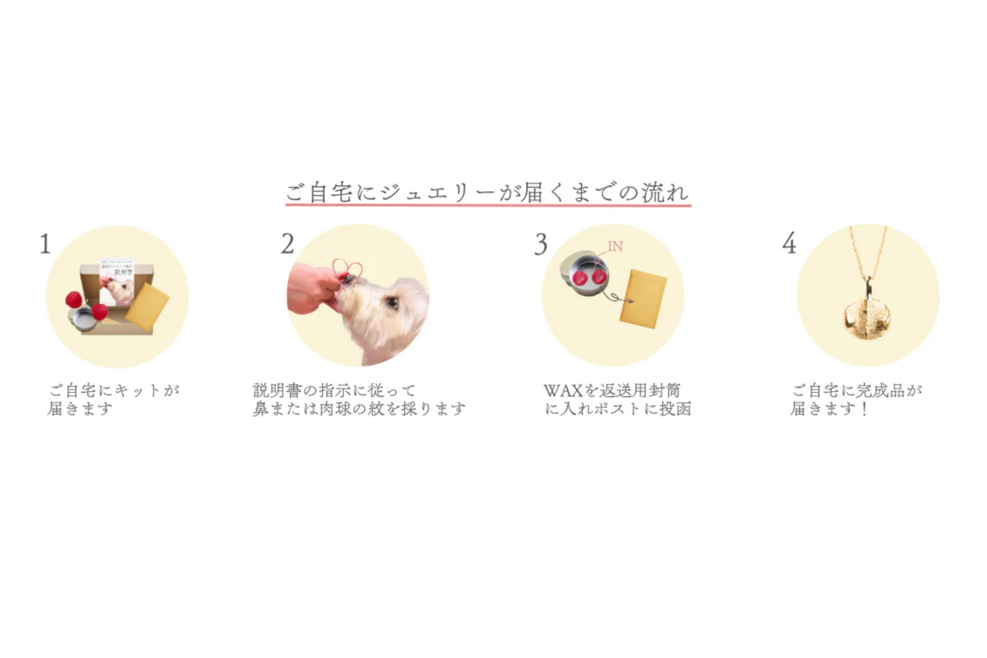 人間ひとり一人が異なる指紋を持つように、犬や猫も一頭一頭それぞれに異なる鼻の紋、鼻紋(びもん)と呼ばれる模様があります。当社は世界にたった一つのオリジナルジュエリーを制作するためのキットの販売を行っています。キットを用いて採取したペットの鼻紋がついたワックスを返送いただいてから1~2か月でネックレスやリングにお仕立てしてお届けしています。