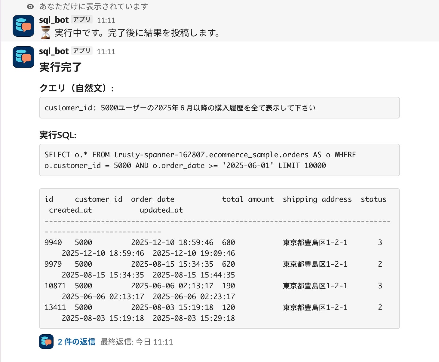 自然文からSQLを自動生成。DDL/DMLはブロックし、過大スキャンを抑制。表/CSV/簡易グラフで結果をSlackに返却。