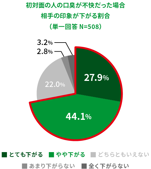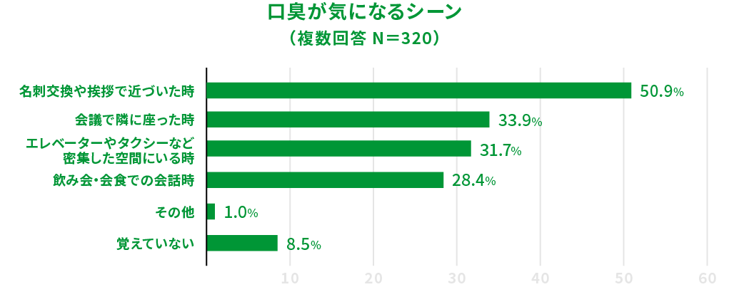 相手の印象が「とても下がる(27.9%)」「やや下がる(44.1%)」と答えた人は7割以上にのぼりました。口臭が気になるシーンTOP3は「名刺交換や挨拶で近づいた時(50.9%)」「会議で隣に座った時(33.9%)」「エレベーターやタクシーなど密集した空間にいる時(31.7%)」。ビジネスシーンでの“距離の近さ”がにおいリスクを高めていることがうかがえます。
