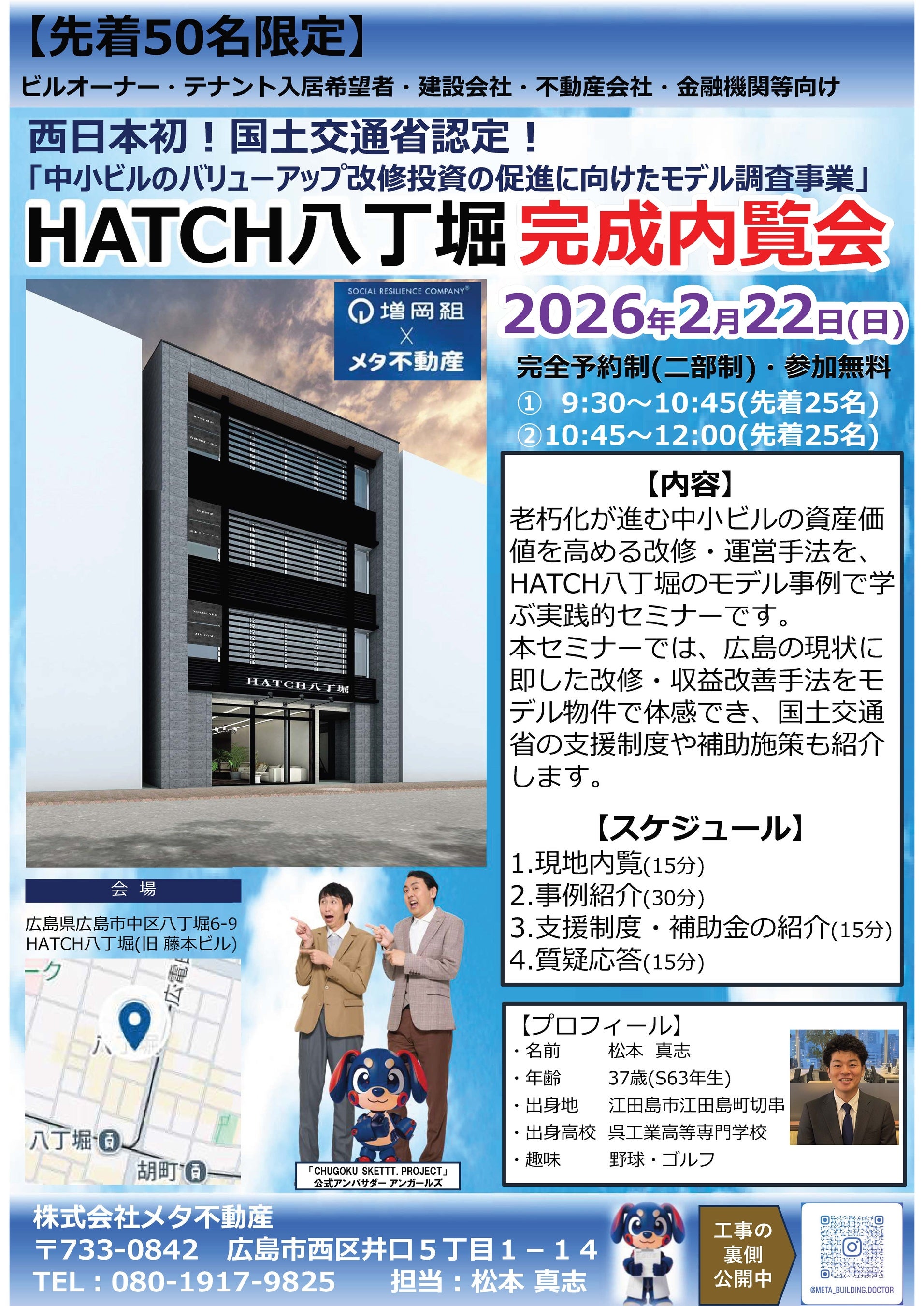 西日本で初めて認定された改修ビル「HATCH八丁堀(旧 藤本ビル)」の完成を記念し、